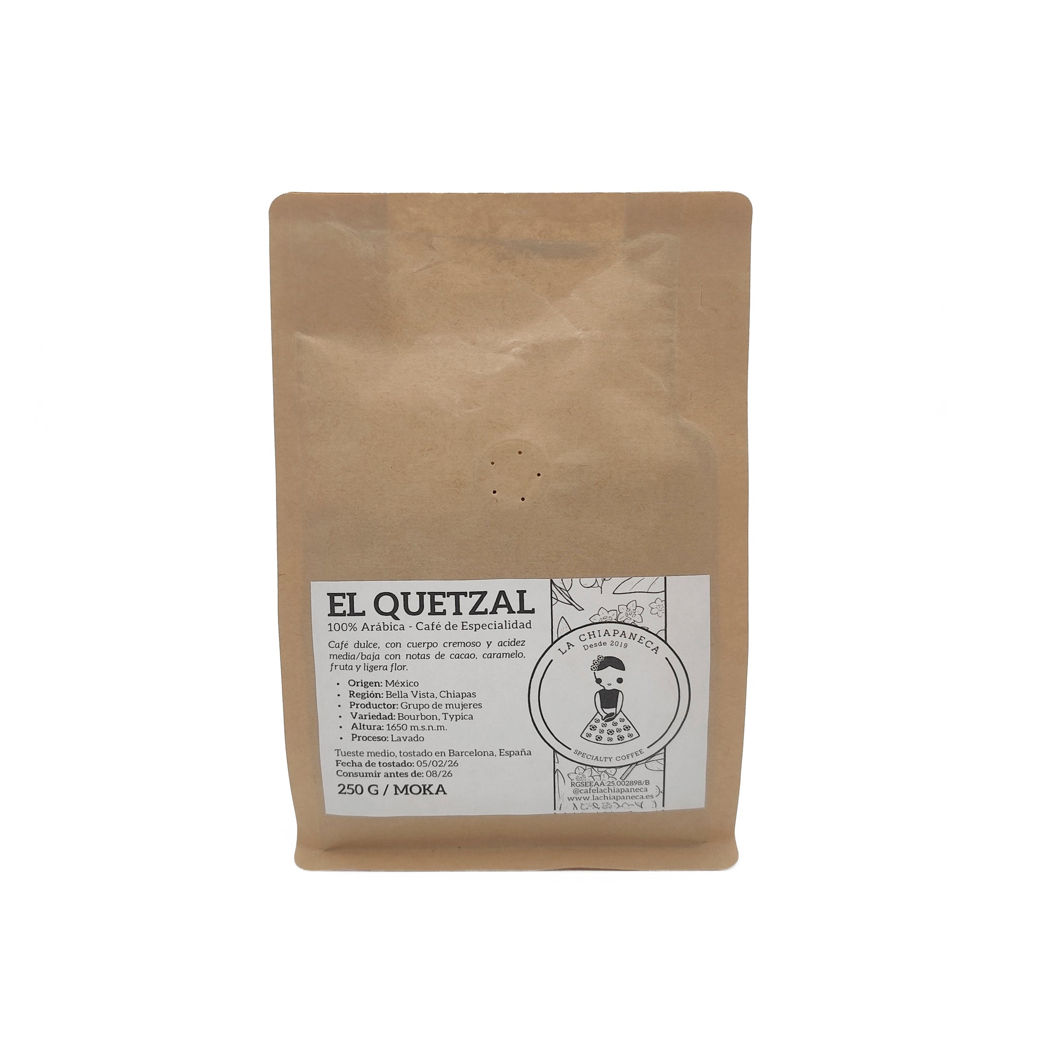 Café de especialidad originario de Bella Vista, Chiapas. De proceso arábica lavado y variedades Bourbon y Typica, ofrece un perfil dulce y balanceado, con acidez media/baja y cuerpo cremoso. En extracción Moka resalta notas de cacao y caramelo, con matices frutales y un ligero toque floral, logrando una taza intensa, aromática y bien estructurada.