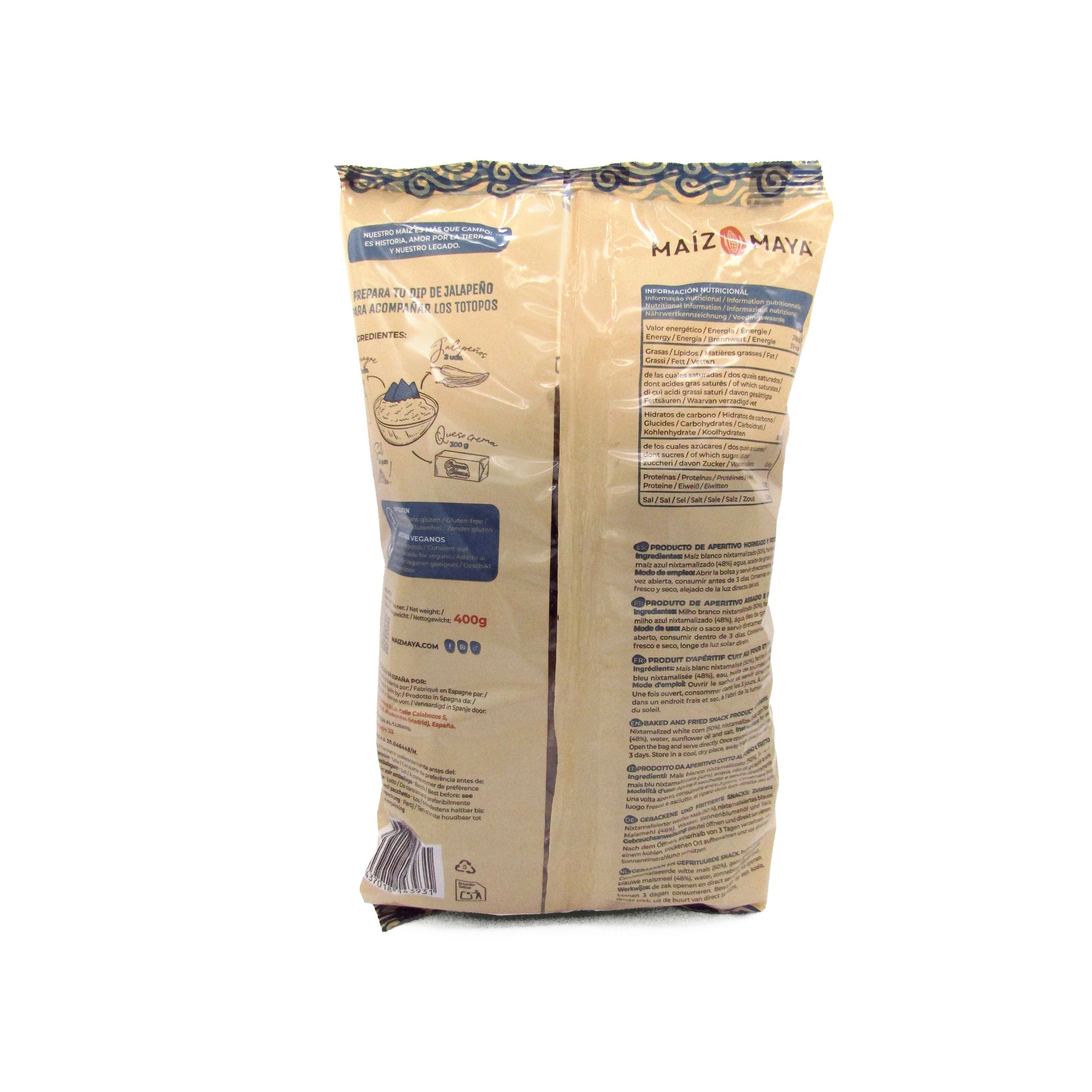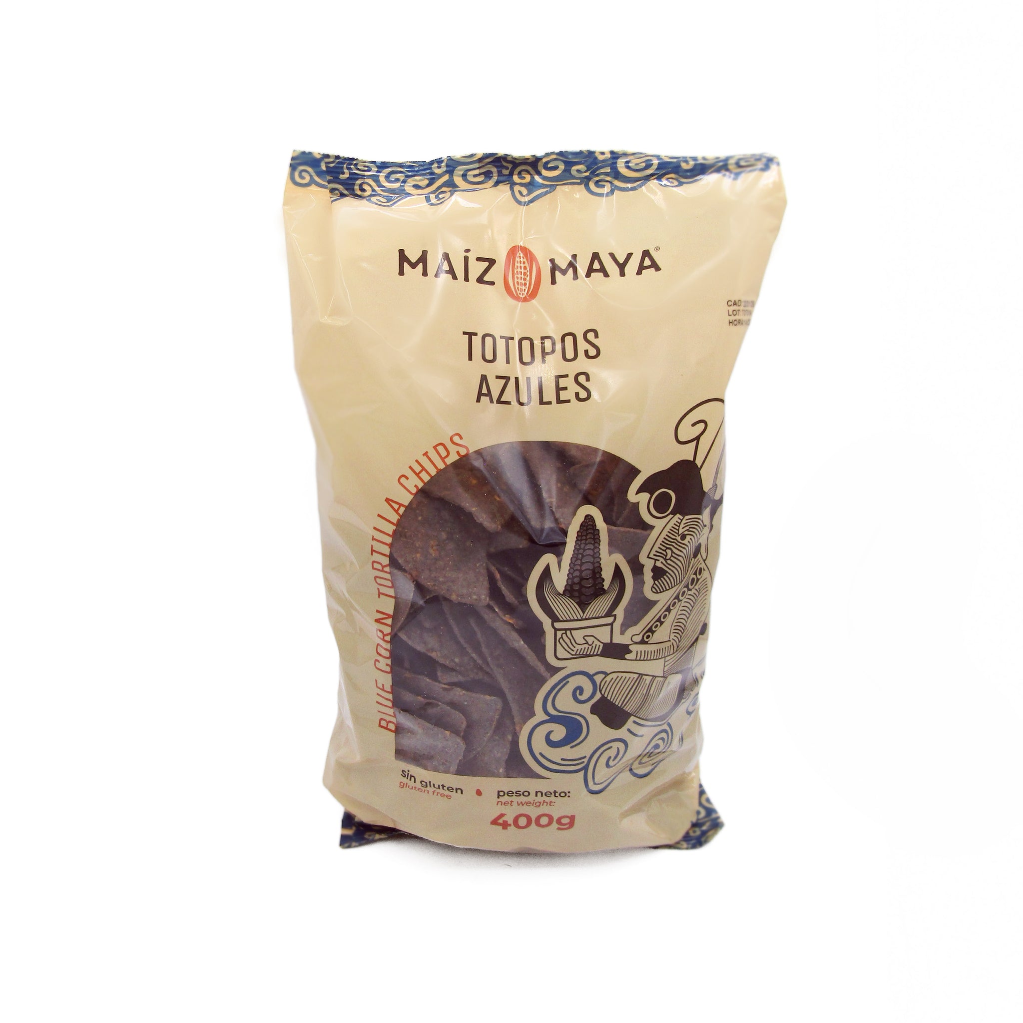 Totopos Azules elaborados maíz blanco nixtamalizado y harina de maíz azul. Un snack diferente y auténtico que resalta por su sabor único y su tono natural.